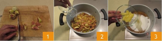 Pour préparer la tarte aux noisettes avec confiture de figues, commencez par la préparation de la confiture. Après avoir pelé tous les figues, coupez-les en 4 parties 1, mettez-les dans une casserole avec l'eau 2 et portez à ébullition. Peu après, ajoutez le sucre, le jus et le zeste de citron 3