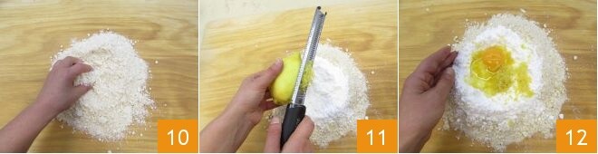 Versez le sablage sur un plan de travail et formez une fontaine 10, au centre versez le sucre glace, le zeste de citron râpé 11 et l'œuf 12.