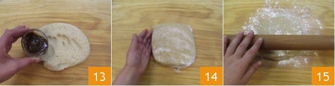 Pétrissez à la main rapidement, pour ne pas trop réchauffer la pâte sablée, et ajoutez également la pâte de noisettes 13 ; lorsque la pâte sera complètement absorbée, enveloppez le pâton dans un film plastique et laissez reposer au réfrigérateur pendant environ 30-40 minutes 14. Une fois le temps écoulé, reprenez la pâte sablée et étalez-la sur un plan de travail légèrement fariné, avec l'aide d'un rouleau à pâtisserie, étalez-la à une épaisseur d'environ un demi-centimètre 15. Gardez la partie restante pour les bandes de décoration.