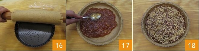 Disposez la pâte sablée aux noisettes dans un moule de 24 centimètres de diamètre, si vous n'utilisez pas un moule perforé, vous devrez le beurrer et le fariner 16, puis versez la confiture de figues 17 et étalez-la sur toute la surface de la pâte à l'aide d'une cuillère. Parsemez avec le praliné de noisettes 18.