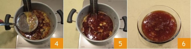 et laissez cuire la confiture en écumant de temps en temps 4. Dès que la compote atteint la température de 104°C 5, assurez-vous en utilisant un thermomètre de cuisine, éteignez le feu et transférez-la dans un bol pour la laisser refroidir 6. Si vous souhaitez conserver la confiture plus longtemps, il vous suffira de stériliser les pots.