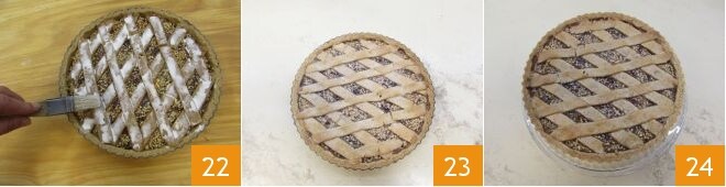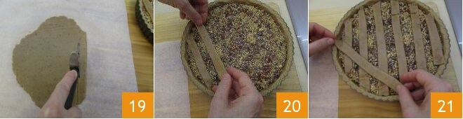 Étalez à nouveau la pâte sablée aux noisettes restante et obtenez des bandes d'environ 2 cm de large, coupez-les avec une roulette lisse 19 et disposez-les sur le moule en les posant d'abord dans un sens 20 puis dans l'autre 21, de manière à former des losanges.