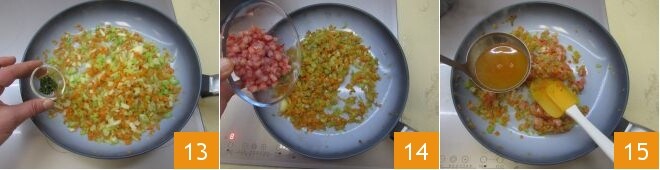 Ajoutez ensuite le thym 13 et laissez dorer tous les ingrédients pendant environ 6-7 minutes. Lorsqu'ils sont bien dorés, ajoutez les crevettes en morceaux (réservez environ 80 grammes) 14 et laissez cuire pendant quelques minutes ; ajoutez environ 50-60 grammes du bouillon de poisson que vous avez préparé 15.