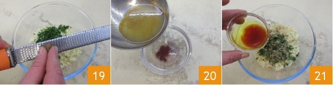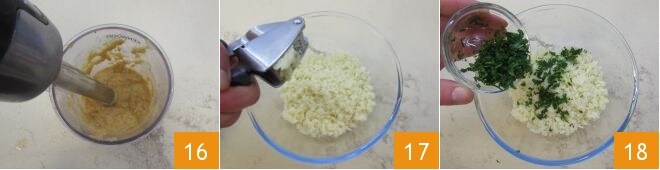 Ajustez le sel et le poivre et laissez cuire pendant 3-4 minutes. Éteignez et transférez les légumes dans un bol à bords hauts, en mixant avec un mixeur plongeant jusqu'à obtenir un mélange crémeux et homogène 16. Réservez le mélange. Prenez maintenant un autre bol et versez-y la mie de pain, hachez-la et ajoutez l'ail écrasé 17, le persil finement haché 18