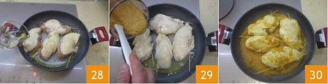 Remplissez les poitrines avec la farce que vous avez obtenue non mixée 25 et scellez vos poches avec de longs cure-dents pour que le mélange intérieur ne déborde pas 26. Ensuite, prenez une poêle et versez-y de l'huile en filet. Déposez-y les poches de poulet et faites-les dorer sur les deux côtés 27.