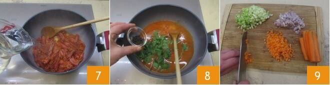 Ensuite, ajoutez l'eau jusqu'à couvrir complètement les carapaces et les têtes des crevettes 7. Ajoutez le persil, le poivre en grains 8 et ajustez le sel (faites attention à ne pas trop saler car la préparation est déjà très savoureuse). Réduisez le feu et laissez mijoter doucement pendant au moins 60 minutes en couvrant avec un couvercle : pendant la cuisson, souvenez-vous d'écumer de temps en temps le bouillon avec une écumoire, en prenant soin de la rincer chaque fois pour éliminer tous les résidus de mousse. Après environ 60 minutes, le bouillon se réduira d'environ la moitié du liquide initial ; filtrez-le avec une passoire à maille fine, en essayant d'obtenir le plus de liquide possible. Enfin, retirez les carapaces, l'échalote et l'ail. Mettez le bouillon de côté et passez à la préparation de la crème de légumes en commençant par le Comment faire le soffritto. Coupez finement les légumes 9.
