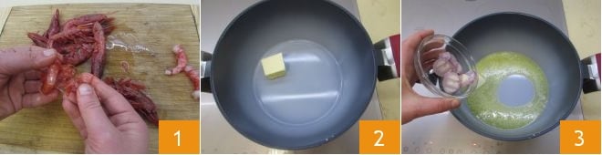 Pour préparer les poches de poulet farcies aux crevettes, commencez d'abord par la préparation du bouillon de crevettes. Prenez les crevettes et lavez-les abondamment à l'eau, enlevez leur carapace, la queue, les pattes et la tête 1. Ensuite, retirez leur intestin avec un cure-dent (vous pouvez consulter l'école de cuisine : Comment nettoyer les crevettes). Placez les crevettes nettoyées dans un bol recouvert de film plastique au réfrigérateur et conservez les carapaces. Prenez ensuite l'échalote, épluchez-la et coupez-la en fines tranches. Dans une casserole, faites fondre le beurre 2, puis ajoutez l'échalote 3