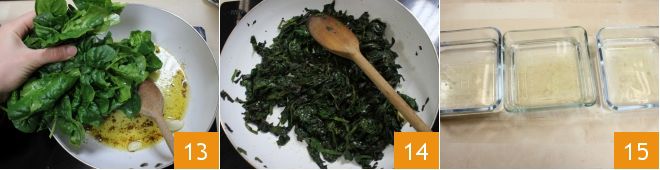 Nettoyez et lavez bien les épinards sous l'eau courante, égouttez-les et faites-les sauter pendant quelques minutes, à feu moyen, dans une poêle antiadhésive avec deux cuillères à soupe d'huile, trois gousses d'ail et les filets d'anchois 13. Une fois cuits, éteignez le feu et gardez-les également de côté 14, mais au chaud. Dans trois bols différents remplis d'eau froide, mettez à tremper la gélatine en feuilles : 5g pour le saumon, 5g pour la dorade et la perche, et 7g pour les épinards 15.