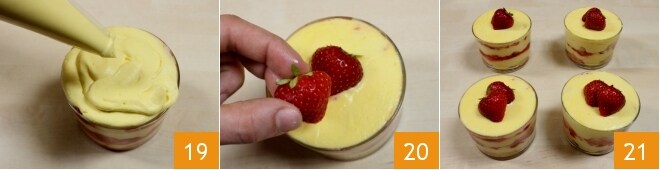 Ensuite, recouvrez avec une couche de fraises 16 et assurez-vous qu'elles adhèrent bien aux côtés des verrines pour un meilleur effet visuel. Recouvrez encore avec la crème 17, puis recommencez avec une moitié de boudoir 18,