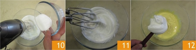 Dès que les blancs d'œufs seront blancs et mousseux, ajoutez les 100 g de sucre restants 10 et continuez à battre jusqu'à obtenir une consistance ferme et solide 11. Incorporez au mélange de jaunes d'œufs et mascarpone un tiers des blancs montés en neige et mélangez avec la spatule énergiquement 12.