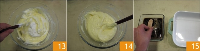 Terminez d'ajouter les blancs restants 13 et mélangez délicatement de haut en bas jusqu'à obtenir une crème homogène 14. À ce stade, imbibez les boudoirs, un à un, dans le café à température ambiante 15.