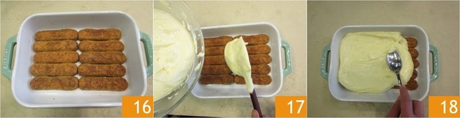 Disposez-les au fur et à mesure à l'intérieur d'un plat de 25x19 cm, de manière ordonnée, de sorte à couvrir toute la surface 16. Versez maintenant la moitié de la crème 17 et nivelez-la 18 pour recouvrir complètement les boudoirs.