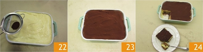 Au moment de le servir, saupoudrez le tiramisù de cacao amer 22, en le recouvrant entièrement 23. Le tiramisù de la tradition est prêt à être coupé et dégusté 24.