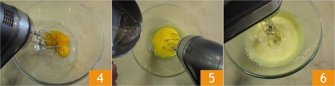 Lorsque vous aurez atteint la température indiquée, commencez à battre les jaunes d'œufs avec un batteur électrique 4 et versez le sirop en filet sur les jaunes, tout en maintenant les fouets en action 5. Continuez à fouetter jusqu'à ce que le mélange soit crémeux 6.