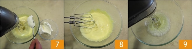 Ajoutez maintenant le mascarpone aux jaunes d'œufs avec les fouets 7 8 ou avec une spatule. Réservez le mélange et versez les blancs d'œufs dans un autre bol. Commencez à les monter, en vous assurant que les fouets soient bien propres 9.