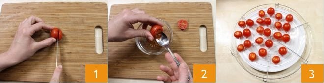 Pour préparer les tomates cerises gratinées farcies de boulgour, commencez par laver et sécher soigneusement les tomates cerises. Placez-les sur une planche à découper et avec un couteau, coupez le chapeau supérieur et réservez-le 1. Évide les tomates cerises avec une cuillère pour enlever les graines 2 et mettez-les à égoutter à l'envers sur une grille 3.