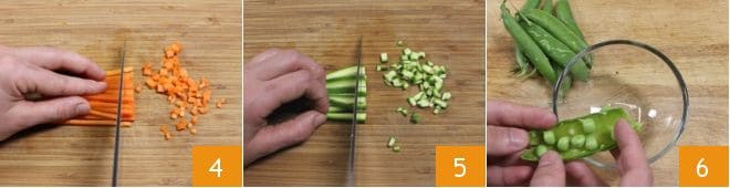 En attendant, préparez la farce : épluchez une carotte, placez-la sur une planche à découper et coupez-la en bâtonnets, puis en dés 4. Rincez bien une courgette sous l'eau et épluchez-la. Ensuite, coupez-la en bâtonnets puis en dés 5. Maintenant, écossez les petits pois frais dans un bol, en retirant les cosses 6; vous devrez obtenir 30 g de petits pois écossés.