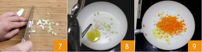 Prenez ensuite un oignon frais, retirez la tige et la base et hachez-le 7. Faites chauffer l'huile dans une poêle antiadhésive large et faites revenir l'oignon à feu doux 8. Puis ajoutez les carottes coupées très finement 9.