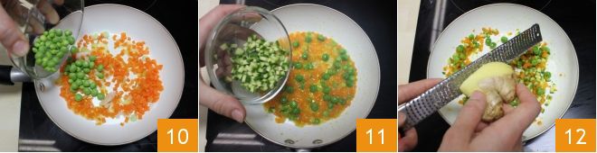 Ajoutez également les petits pois écossés 10 et faites cuire à feu doux pendant environ 20 minutes. Aux 5 dernières minutes de cuisson, ajoutez aussi les courgettes en dés 11, salez et poivrez et terminez la cuisson. Une fois la cuisson terminée, ajoutez le gingembre frais râpé 12.