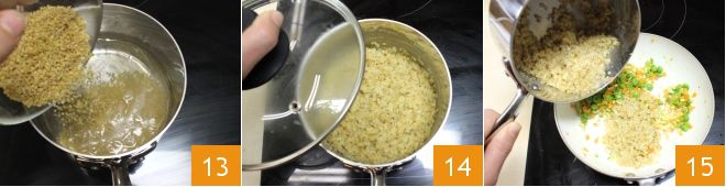 À ce stade, faites cuire le boulgour : versez l'eau dans une casserole, salez avec une demi-cuillère à café de sel et portez à ébullition, puis ajoutez le boulgour et laissez cuire 7 minutes 13 ou consultez les temps de cuisson indiqués sur l'emballage. Une fois cuit, c'est-à-dire lorsque le boulgour a absorbé l'eau de cuisson et a gonflé, couvrez pendant 5 minutes 14. Passé ce temps, ajoutez-le aux légumes et si nécessaire, rectifiez l'assaisonnement de sel et de poivre 15.