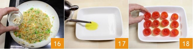Ajoutez au boulgour avec les légumes aussi les pignons de pin grillés 16 et mélangez pour bien incorporer le tout. Maintenant, prenez un plat allant au four ou un plateau, versez un filet d'huile 17 et placez les tomates cerises que vous avez vidées 18, en les salant légèrement.