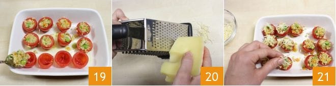 Ensuite, remplissez-les avec le mélange de boulgour et légumes 19. Râpez la quantité d'emmental que vous préférez 20 et saupoudrez-le sur les tomates cerises farcies 21.
