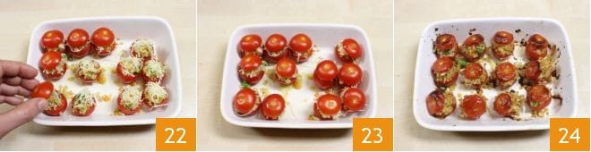 Prenez les chapeaux des tomates cerises que vous aviez mis de côté et disposez-les sur les tomates cerises farcies, en les fermant 22. Une fois fermées, enfournez dans un four statique préchauffé à 180° pendant 20 minutes, si vous utilisez un four ventilé, faites cuire à 160° pendant 10 minutes 23. Lorsqu'elles seront bien dorées et légèrement grillées 24, sortez-les du four, laissez-les tiédir et servez-les!