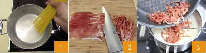 Coupez les tranches de speck en julienne 2 et faites-les légèrement griller dans une poêle sans huile. Mélangez le speck rôti avec la béchamel 3 et mettez-la de côté.