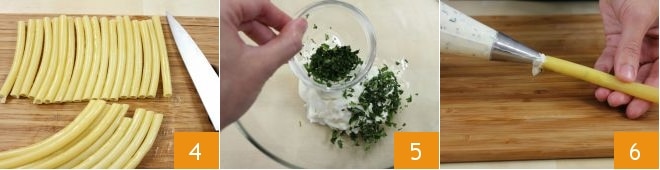 Égalisez les ziti et coupez-les tous à la même taille à l'aide d'une paire de ciseaux. Mettez le fromage frais à tartiner dans un bol, ajoutez de la ciboulette et du basilic finement hachés 5 et mélangez le tout. Avec une poche à douille munie d'une petite douille lisse, remplissez les ziti avec la crème préparée 6.