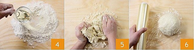 Mélangez avec les mains et, petit à petit, ajoutez le vin blanc en filet 4. Ajoutez les graines de vanille et pétrissez énergiquement avec les mains 5 pour obtenir une pâte compacte et bien amalgamée. Couvrez la pâte obtenue avec du film plastique 6 et laissez-la reposer 20 minutes au réfrigérateur.