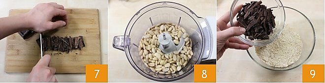Entre-temps, hachez finement le chocolat noir 7 et broyez les amandes dans un mixeur 8. Dans un grand bol, mélangez les deux ingrédients 9 et