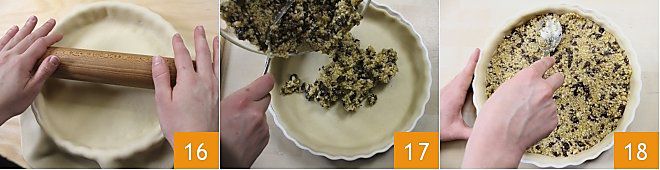 Éliminez l'excédent de pâte en pressant les bords du moule avec le rouleau à pâtisserie 16 et garnissez le gâteau avec la préparation 17, en lissant bien avec une cuillère 18.