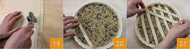 Pétrissez et étalez à nouveau les chutes de pâte et, avec une roulette à bord dentelé, découpez des bandelettes 19, que vous placerez sur le gâteau d'abord en diagonale 20, de manière à former des losanges en les croisant 21.