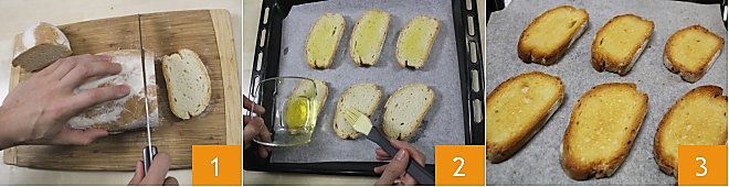 Pour préparer le trio de bruschettas, commencez par le pain : placez la baguette sur une planche à découper et tranchez-la en morceaux d'environ 2-3 cm d'épaisseur 1. Ensuite, formez une couche de papier sulfurisé sur une plaque de cuisson, disposez-y les tranches de pain et huilez-les à l'aide d'un pinceau pour uniformiser l'huile 2. À ce stade, enfournez dans un four statique préchauffé à 220° pendant 5 minutes puis réglez sur le gril et laissez cuire encore 2 minutes (si vous utilisez un four à chaleur tournante, faites cuire à 200° pendant 5 minutes puis réglez sur gril pour 2 minutes supplémentaires). Lorsque les tranches de pain seront bien dorées et légèrement grillées, elles seront prêtes à être garnies 3.