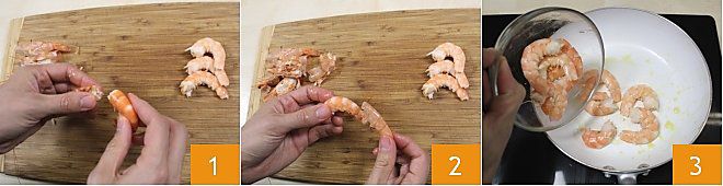 Pour préparer les bruschettas aux crevettes et pesto de courgettes, commencez par nettoyer les crevettes : retirez les têtes 1 et décortiquez-les 2. Ensuite, versez un filet d'huile dans une poêle antiadhésive, ajoutez les crevettes décortiquées 3 et faites cuire pendant 5 minutes. Dans cette recette, des crevettes décongelées ont été utilisées, vous pouvez aussi utiliser des crevettes fraîches, en les faisant cuire jusqu'à ce qu'elles aient une couleur rosée. Pour découvrir comment nettoyer au mieux les crevettes fraîches, consultez l'école de cuisine : Comment nettoyer les crevettes. Si vous utilisez des crevettes déjà décortiquées, il vous en faudra environ 100 g.