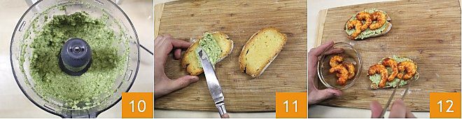 Actionnez le mixeur jusqu'à obtenir un mélange dense et crémeux 10, que vous allez tartiner sur les tranches de pain grillé 11. Ajoutez les crevettes 12 et vos bruschettas aux crevettes et pesto de courgettes seront prêtes à être servies !
