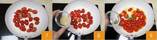 Caramélisez maintenant les tomates cerises. Lavez soigneusement les tomates cerises et coupez-les en deux. Ensuite, prenez une poêle antiadhésive, versez-y un filet d'huile et les tomates coupées 7. Ajoutez le sucre de canne 8 et le thym 9 et faites cuire pendant 5 minutes à feu moyen, jusqu'à ce que les tomates cerises soient légèrement fanées et aient perdu un peu de leur liquide.