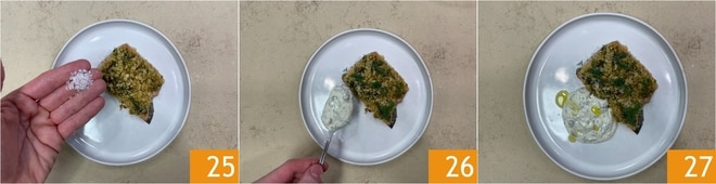 Mélangez pour amalgamer 13 et recouvrez les filets avec la panure 14, vous devez obtenir une épaisseur d'environ 1 cm 15. Assaisonnez avec un filet d'huile et faites cuire dans un four ventilé préchauffé à 190° pendant 12-13 minutes (le temps peut varier en fonction de l'épaisseur du filet).