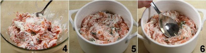 la ricotta et mélangez bien les ingrédients 4. Beurrez 4 cocottes allant au four, placez-y le mélange de saumon et ricotta 5 et faites un petit creux au centre de chaque cocotte avec le dos d'une cuillère à café 6.