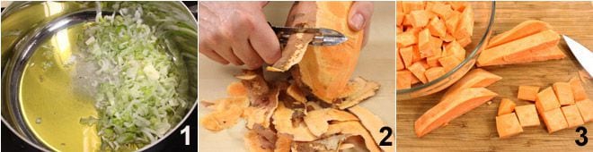 Pour préparer la velouté de patates douces, nettoyez les oignons nouveaux et émincez-les finement, puis faites-les revenir à feu très doux avec l'huile et le beurre pendant au moins 15 minutes dans une casserole 1. Pendant ce temps, épluchez les patates 2 et coupez-les en cubes pas trop gros 3.