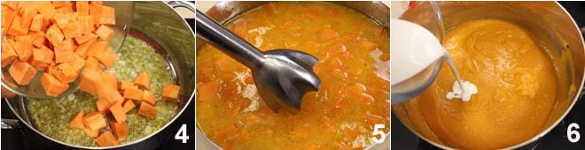 Quand les oignons seront attendris mais sans coloration, ajoutez dans une casserole les morceaux de patates douces 4 puis le bouillon de légumes; ajustez en sel, couvrez avec un couvercle et laissez cuire jusqu'à ce qu'elles deviennent tendres (environ 20 minutes). Passez le mélange au mixeur plongeant 5 jusqu'à obtenir une crème lisse, douce comme du velours. Ajoutez à cette crème de patates douces la crème fraîche 6, le paprika doux et ajustez en sel. Si la velouté est trop épaisse, ajoutez un peu plus de bouillon de légumes.