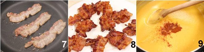 Chauffez une poêle antiadhésive et quand elle est bien chaude, déposez-y les tranches de lard 7 et faites-les dorer des deux côtés, puis égouttez-les de l'excès de graisse et pliez-les sur elles-mêmes pour former un V, puis placez-les sur une assiette 8. Versez la velouté dans 4 assiettes creuses (pas trop grandes), de préférence 4 petits bols, saupoudrez de quelques pincées de paprika 9, placez au centre une tranche de lard, terminez avec un filet d'huile d'olive extra vierge et servez avec des croûtons de pain ou des tranches de pain grillé.