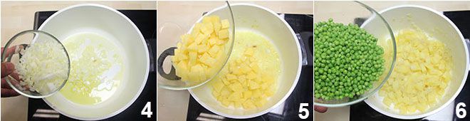 ajoutez l'oignon pour le faire revenir 4. Quand l'oignon est bien doré, ajoutez les pommes de terre coupées en dés 5 et faites-les revenir pendant 5 minutes. À ce stade, ajoutez les petits pois 6, mélangez et recouvrez les légumes de bouillon de légumes ou d'eau.