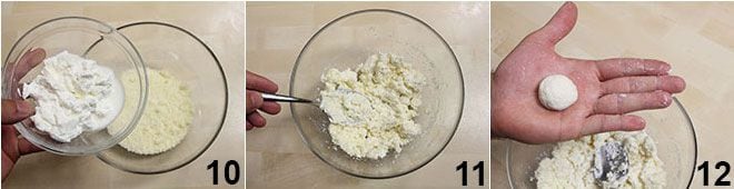 Une fois que la velouté de petits pois est prête, procédez à la fabrication des petites boules avec le fromage : dans un bol, mettez la ricotta et le parmesan 10 et travaillez les deux fromages avec une cuillère jusqu'à obtenir un mélange homogène 11. Ensuite, prenez une cuillère de ce mélange et façonnez-la en boule avec vos paumes 12.