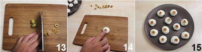 Coupez les olives farcies en fines tranches 13 et posez-les délicatement sur les petites boules de fromage 12 : les olives seront les pupilles de vos globes. Une fois que les petits yeux sont prêts 15, disposez-les délicatement sur la velouté de petits pois, que vous aurez versée dans des bols individuels. Alors, que pensez-vous, votre velouté de petits pois a-t-elle un aspect effrayant ?