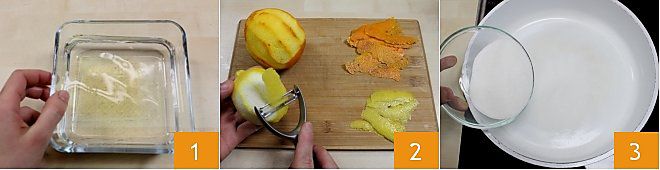 Pour préparer le vin gelée, commencez par la gélatine qui servira à donner la consistance au dessert. Dans un bol, faites tremper les feuilles de gélatine dans de l'eau froide pendant 10 minutes 1. Ensuite, épluchez les agrumes à l'aide d'un éplucheur ou d'un petit couteau en veillant à ne prélever que la partie la plus externe de l'écorce, pas la partie blanche 2. Dans une grande poêle, versez le sucre 3 (vous pouvez déjà la placer sur le feu mais ne l'allumez pas).