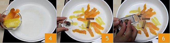 Ensuite, ajoutez les écorces des agrumes que vous avez récupérées 4. Puis ajoutez les bâtons de cannelle et les clous de girofle 5. Placez l'anis étoilé et râpez une demi-noix de muscade directement dans la poêle 6.