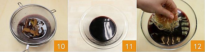 Laissez bien égoutter le liquide de la passoire qui a retenu les épices et les écorces d'agrumes utilisées pendant la cuisson 10 ; laissez tiédir le mélange 11. Ensuite, reprenez les feuilles de gélatine mises à tremper, pressez-les soigneusement et versez-les dans le vin tiédi 12.