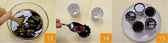 Mélangez pour faire fondre la gélatine 13. Lorsqu'elle est complètement dissoute, à l'aide d'une cuillère, versez le mélange dans les moules appropriés d'une capacité de 70 ml chacun 14, en les remplissant presque jusqu'au bord 15.