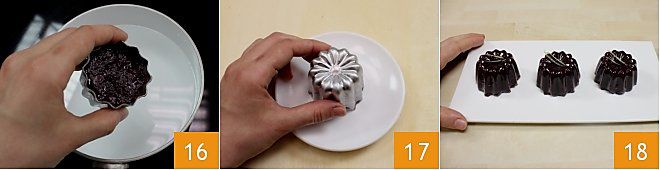 Placez maintenant les moules au réfrigérateur pendant au moins 3 heures pour que le mélange se solidifie. Une fois le temps nécessaire écoulé, retirez les moules du réfrigérateur et avant de les démouler, plongez-les un par un dans une petite casserole d'eau bouillante pendant quelques instants afin de les démouler plus facilement 16. Ensuite, retournez-les sur une petite assiette à dessert et retirez délicatement le moule 17. Vous pouvez également choisir de présenter les gelées de vin gelée ensemble sur un grand plat de service et de les garnir avec des lanières d'écorce de citron 18 !